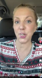 Julie, widely known online as “Hospice Nurse Julie,” has spent years caring for patients during end-of-life stages. Through her educational videos and public discussions, she has helped many families better understand what dying can look like—and why it is often more natural than many people realize.